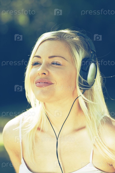 Молодая женщина слушает музыку или аудио книги