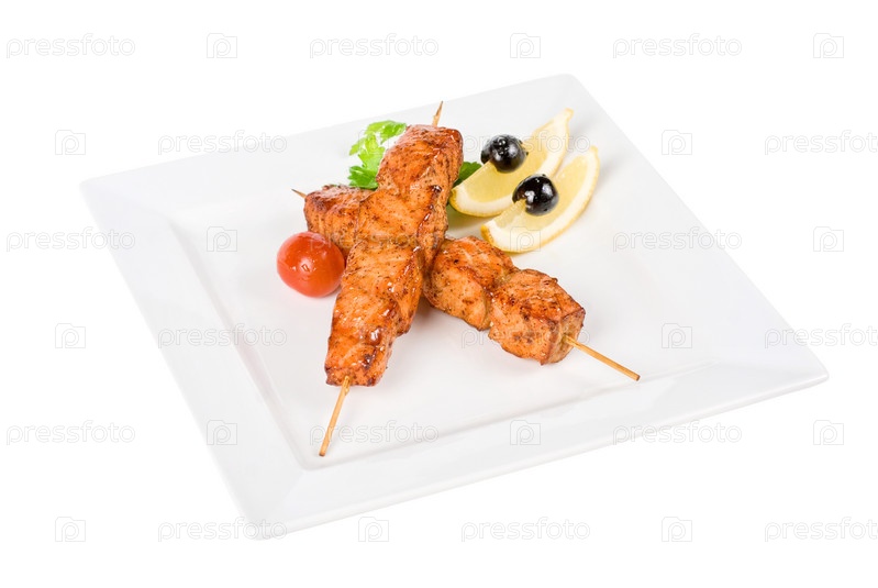 Шашлык из мяса лосося на тарелке с зеленым салатом и лимоном на белом фоне