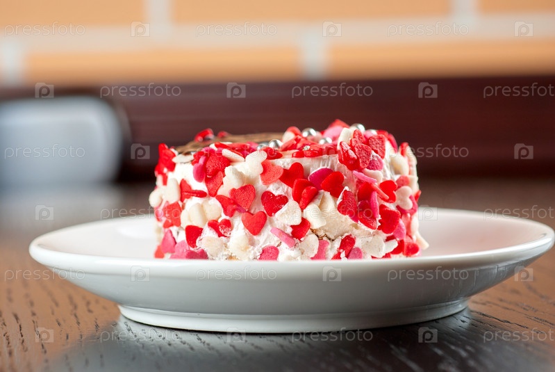 Пирожное с сердечками на белой тарелке