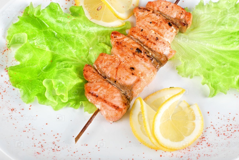 Шашлык из лосося с лимоном и листьями салата