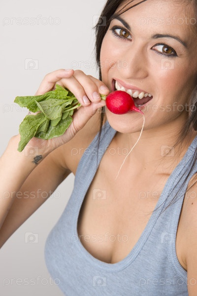 Счастливая женщина ест редис