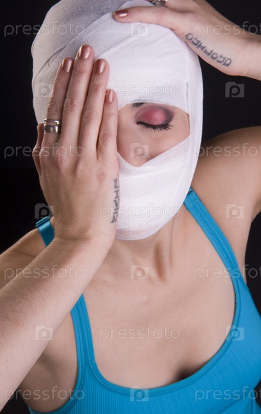 Женщина с бинтовой повязкой держит руку у лица