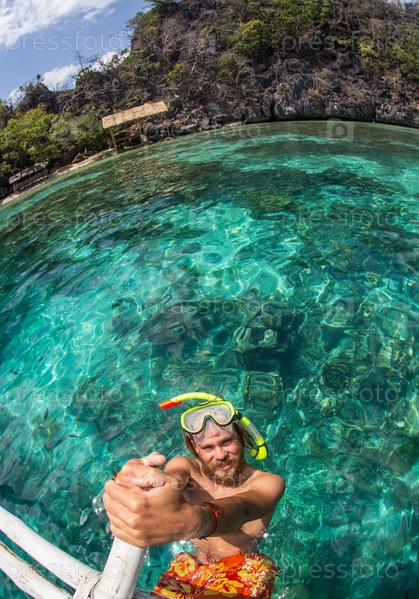 Молодой человек, с трубкой в ясно мелководное море тропических