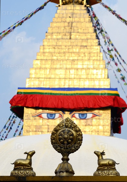 Будда глаза ступе ступы и колесо Дхармы с двух оленей, Катманду, Непал