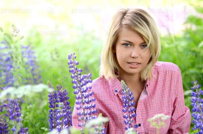 Красивая женщина в поле с Люпен