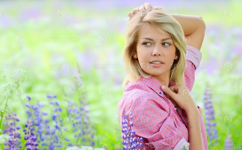 Красивая женщина в поле с Люпен