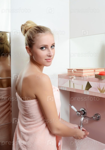 Женщина блондинка в полотенце розовый моет руки