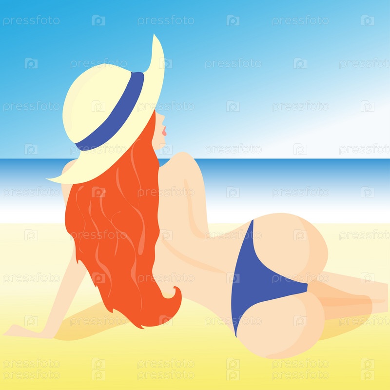 Иллюстрация девушка, лежа на пляже в шортах и шляпа