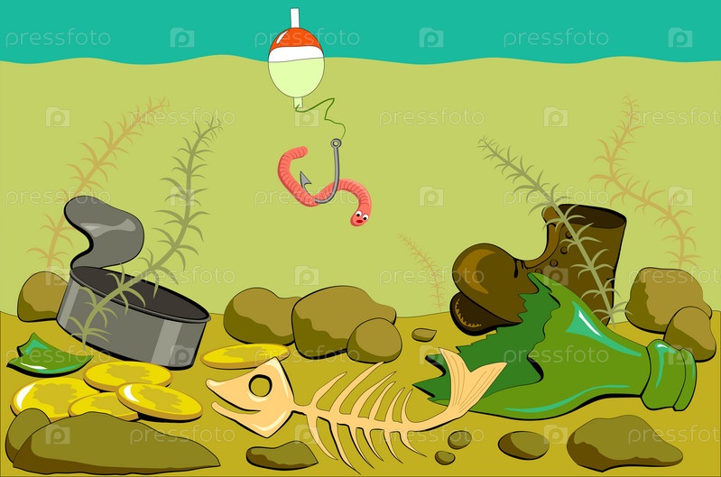 Рыбалка в грязной реке. иллюстрация