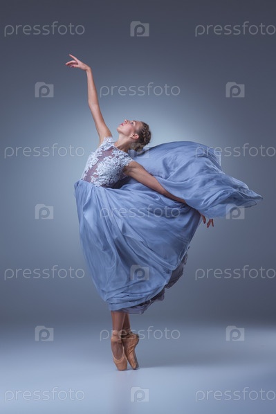 Красивые балерина танцует в голубой длинное платье