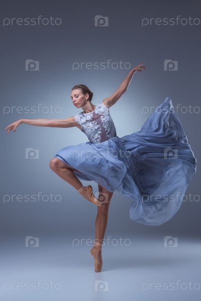 Красивые балерина танцует в голубой длинное платье