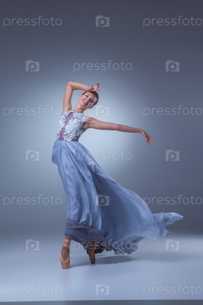 Красивые балерина танцует в голубой длинное платье