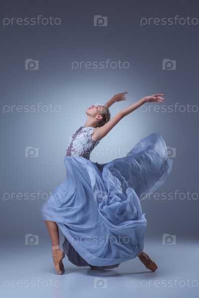 Красивые балерина танцует в голубой длинное платье
