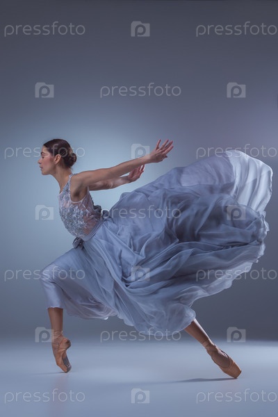 Красивые балерина танцует в голубой длинное платье
