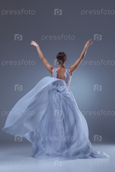 Красивые балерина танцует в голубой длинное платье