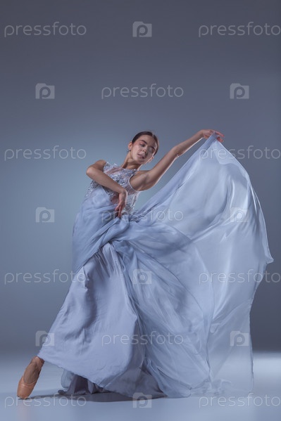 Красивые балерина танцует в голубой длинное платье