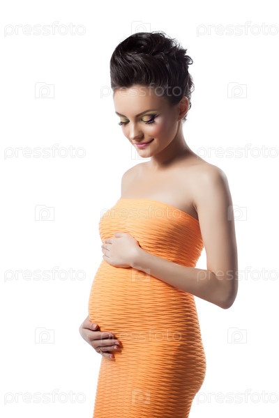 Счастливый стильный беременная женщина, изолированные на белом фоне