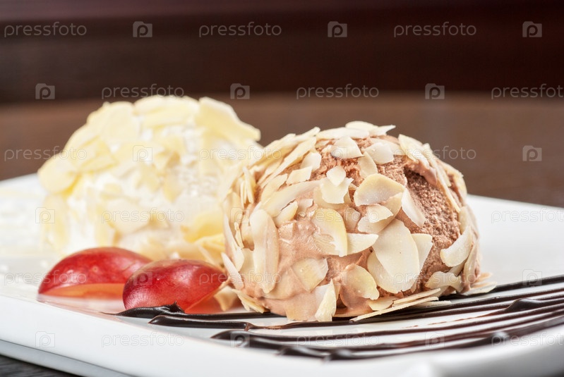 Десерт из мороженого с миндалем, шоколадом и виноградом