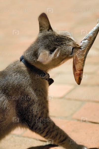 Кошка с рыбой в зубах