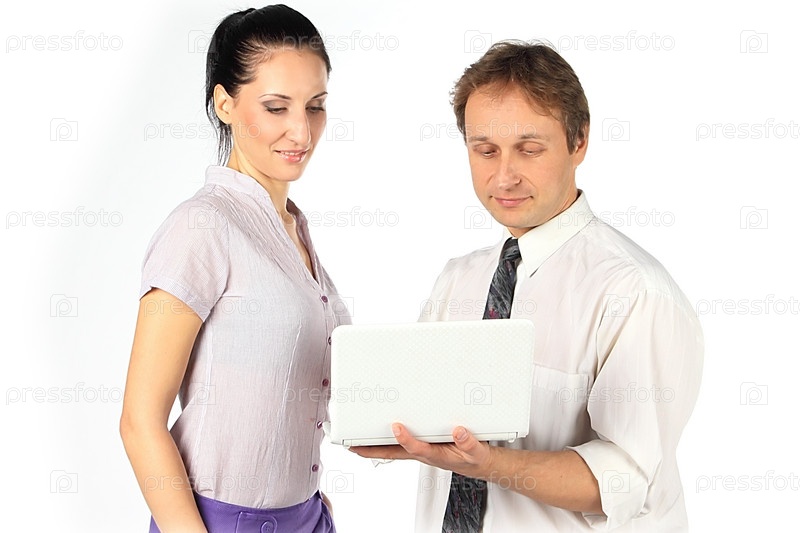 Мужчина и женщина с нетбуком на белом фоне