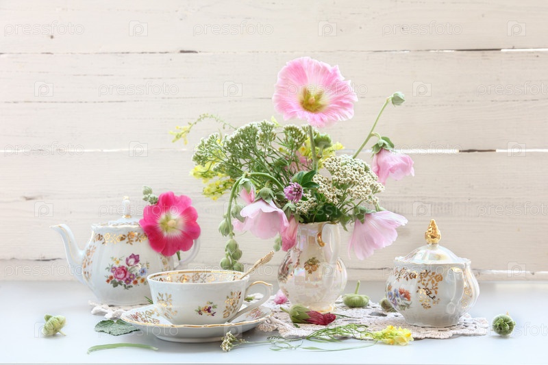 Чайный сервис и красивые полевые цветы