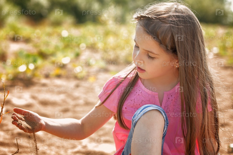 Милая девушка задумчиво игры с песком в парке