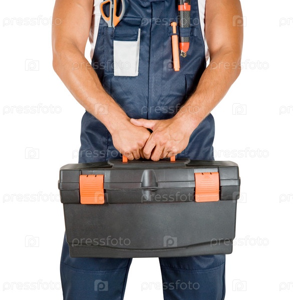 Ремонтник с коробкой инструментов на белом фоне