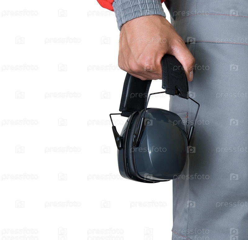 Работник с защитными наушниками в руке на белом фоне