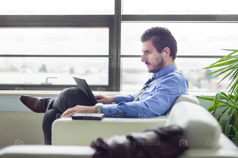 Бизнесмен в офисе работает на портативном компьютере