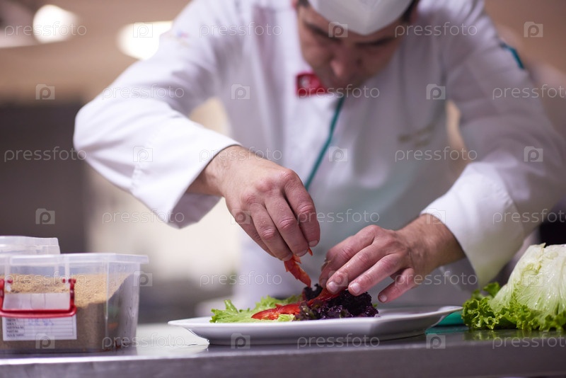 Шеф-повар отеля кухне готовит и украшения продуктов питания