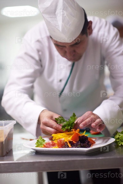 Шеф-повар отеля кухне готовит и украшения продуктов питания