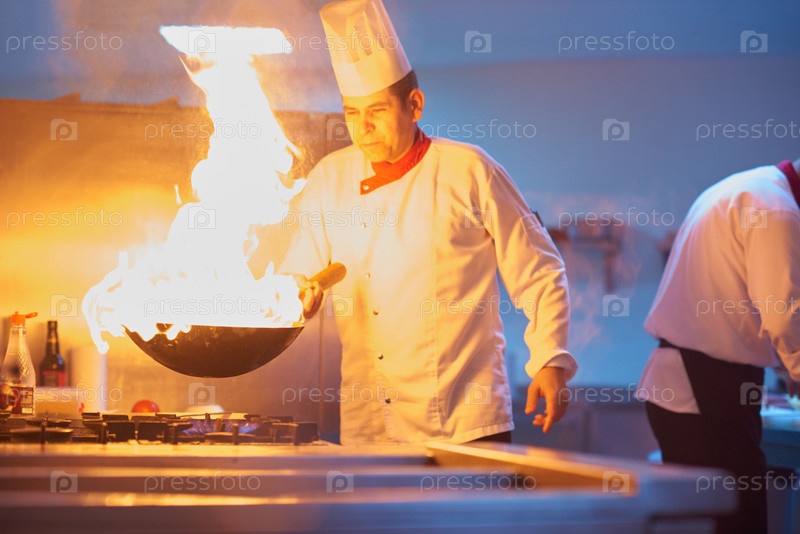 Шеф-повар отеля кухне готовить пищу с огнем
