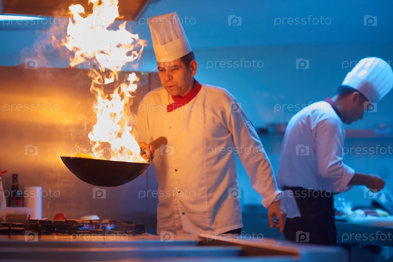 Шеф-повар отеля кухне готовить пищу с огнем
