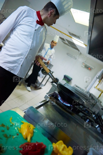 Шеф-повар отеля кухне готовить пищу с огнем