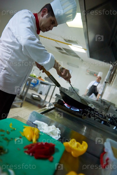 Шеф-повар отеля кухне готовить пищу с огнем