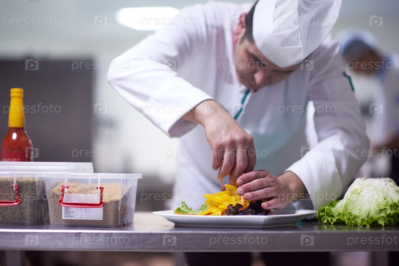 Шеф-повар отеля кухне готовит и украшения продуктов питания