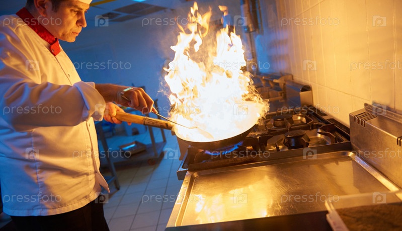 Шеф-повар отеля кухне готовить пищу с огнем