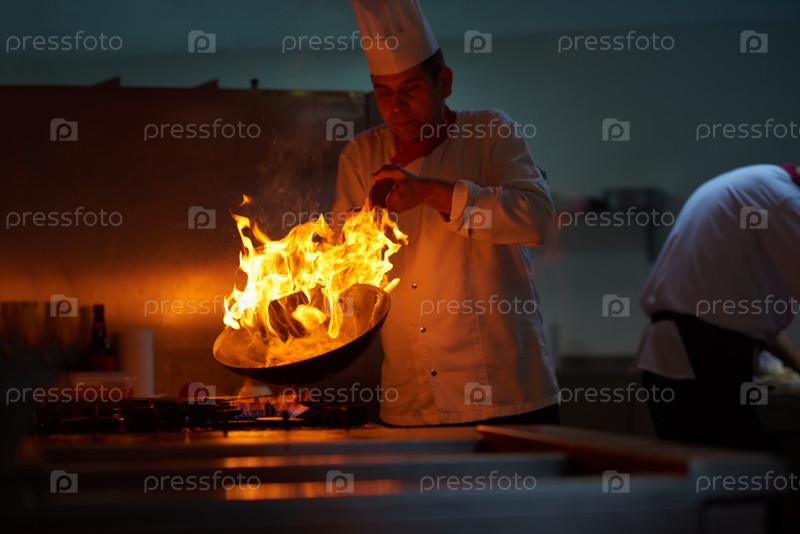 Шеф-повар отеля кухне готовить пищу с огнем