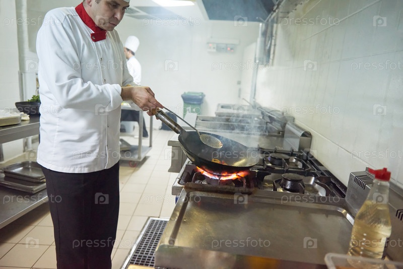 Шеф-повар отеля кухне готовить пищу с огнем