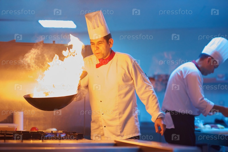 Шеф-повар отеля кухне готовить пищу с огнем