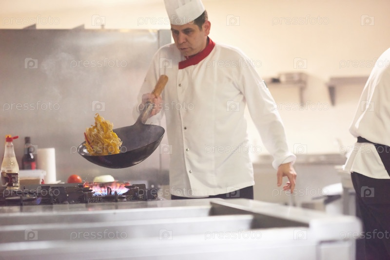 Шеф-повар отеля кухне готовить пищу с огнем