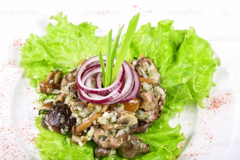 Ассортимент свежих грибов на листе салата крупным планом на тарелке