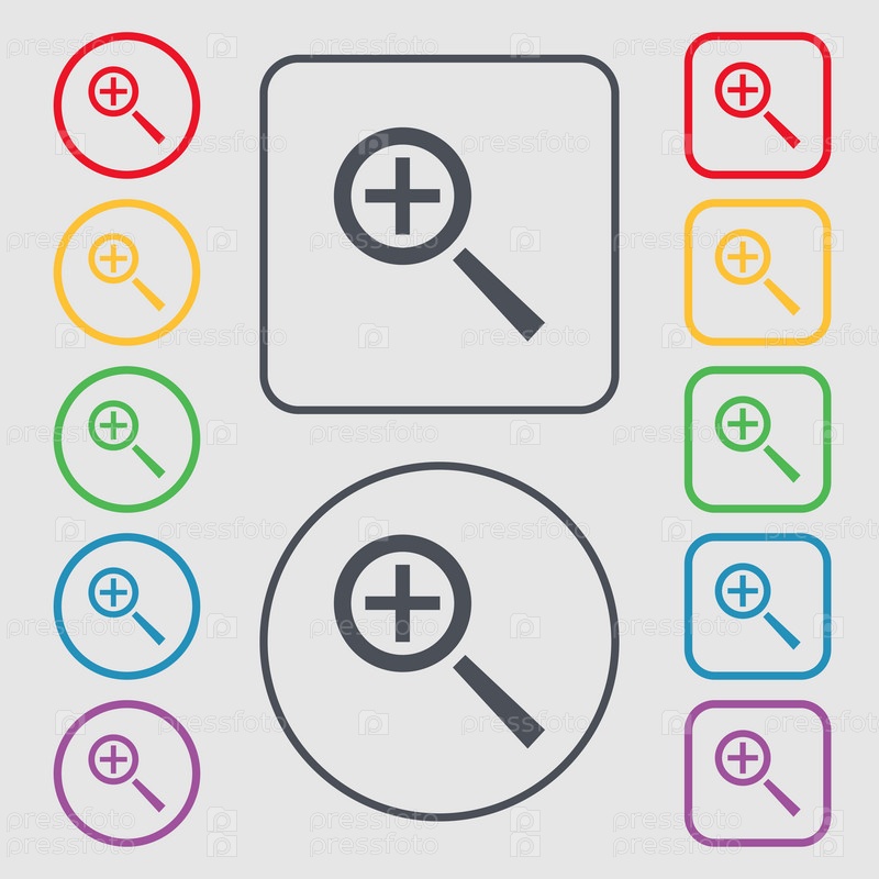 Лупа стекла, зум инструмент значок знак. Символы на круглых и квадратных кнопок с рамкой. Вектор