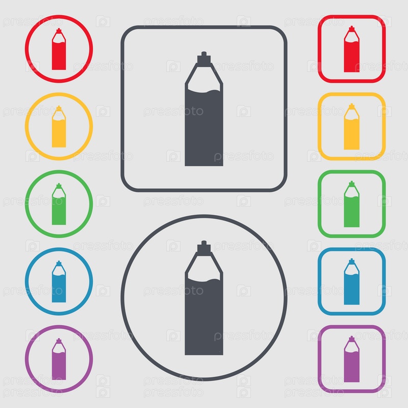 Пластиковая бутылка с напитком значок знак. Символы на круглых и квадратных кнопок с рамкой. Вектор