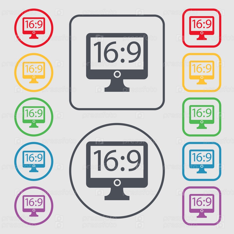 Соотношение сторон 16 9 широкоэкранный ТВ значок знак. Символы на круглых и квадратных кнопок с рамкой. Вектор