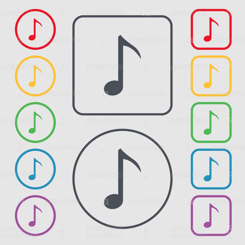 Музыка Примечание значок знак. Символы на круглых и квадратных кнопок с рамкой. Вектор