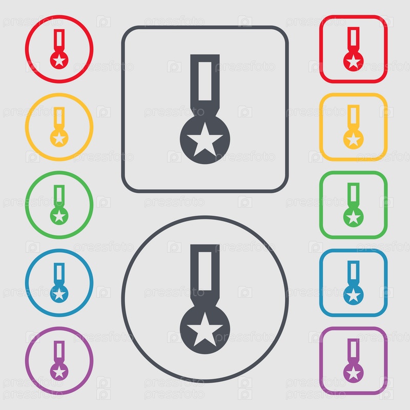 Премия, Медаль Почета значок знак. Символы на круглых и квадратных кнопок с рамкой. Вектор