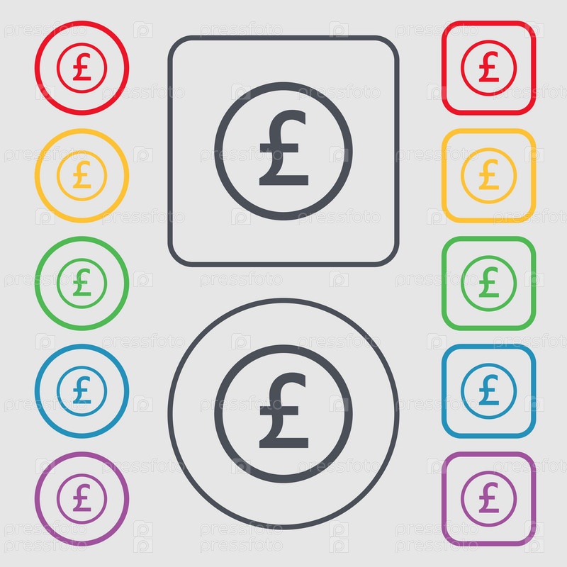 Знак фунта стерлингов значок. Символы на круглых и квадратных кнопок с рамкой. Вектор