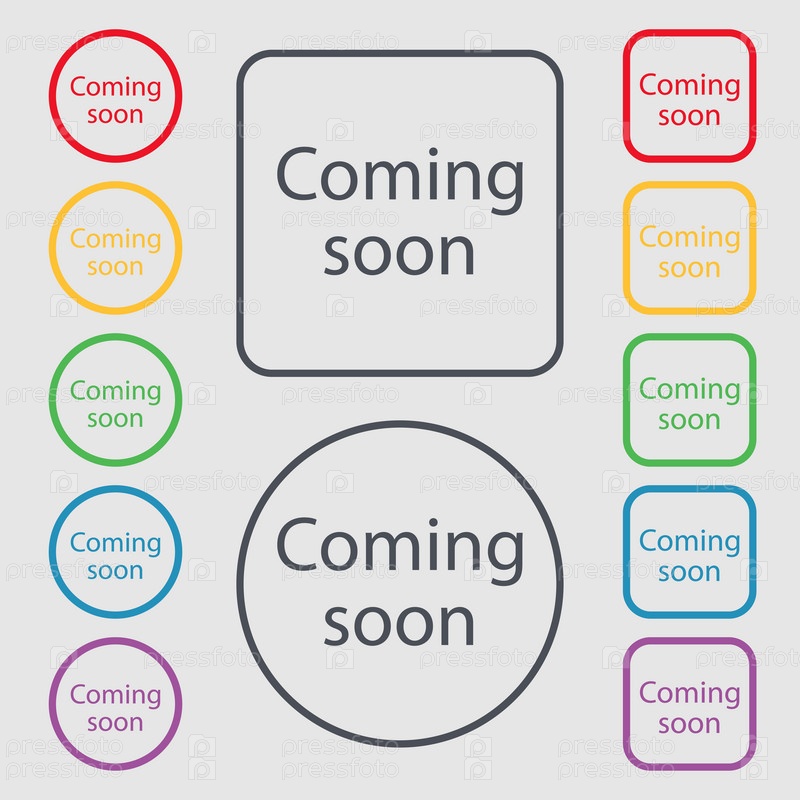 Приходить скоро подписать значок. Продвижение объявление символ. Символы на круглых и квадратных кнопок с рамкой. Вектор