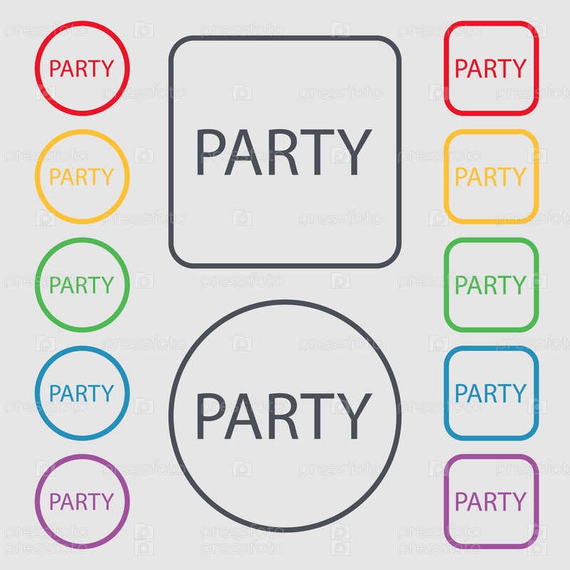 Значок участника знак. День рождения воздушный шар с символом каната или ленты. Символы на круглых и квадратных кнопок с рамкой. Вектор